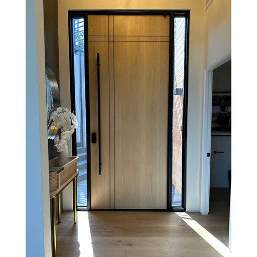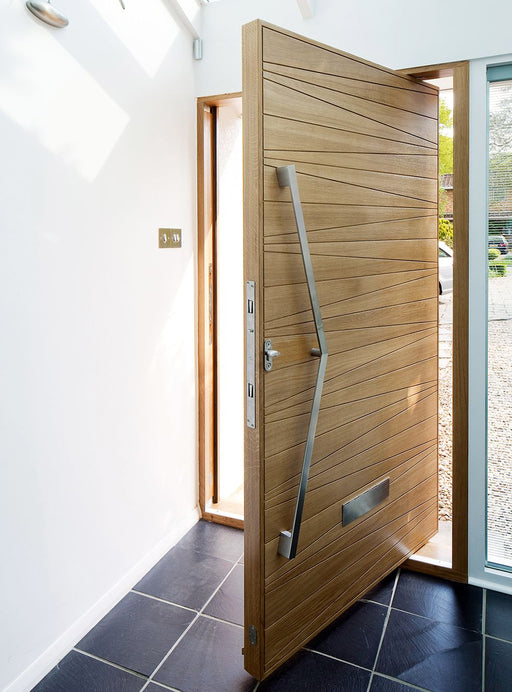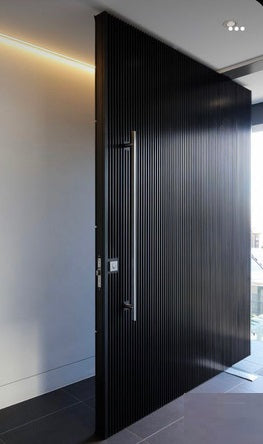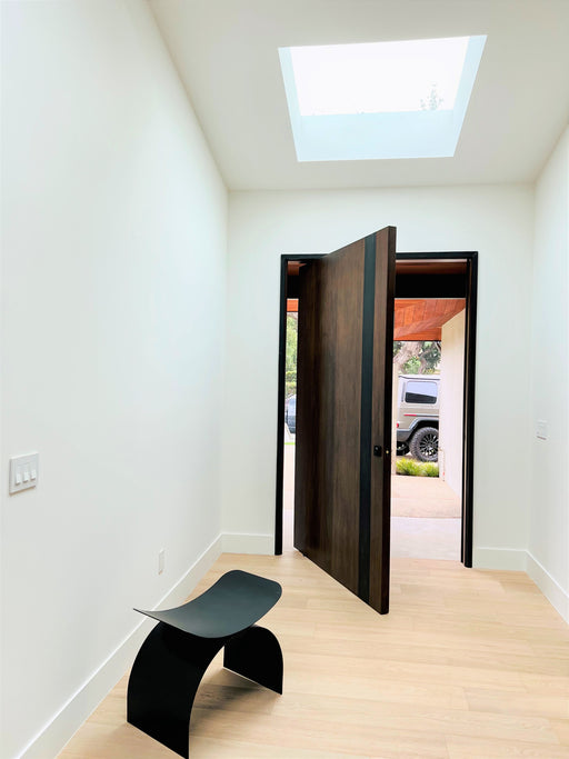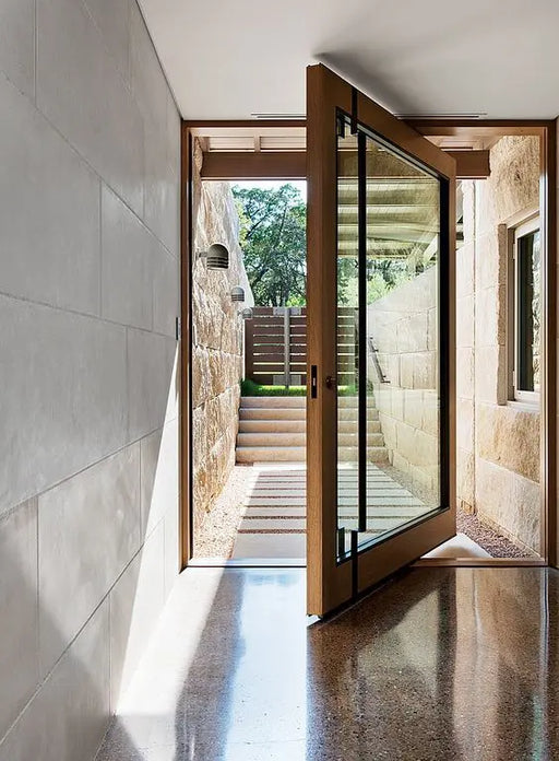 A pivot door rotates on a pivot box in the floor and the top jamb rather than traditional door side hinges. These doors have become popular in last few years because they are ideal for large panels, have a cool contemporary vibe, and unique opening architectures. Pivot Doors revolve around a hinge that is offset from where a hinge would be on a traditional door. The craftsmanship and technology of a Pivot hinge allows for a larger opening than most other types of doors since traditional hinges cannot carry the same kind of weight.